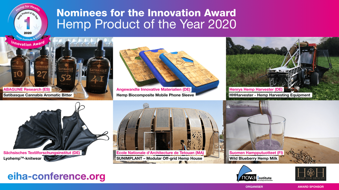 Zum dritten Mal in Folge wird der Innovationspreis „Hemp Product of the Year“ vergeben. Nominiert sind Unternehmen mit neuen Ideen und Entwicklungen. Die Gewinner werden auf der „17th EIHA Hemp Conference“ online während der laufenden Konferenz gewählt.
